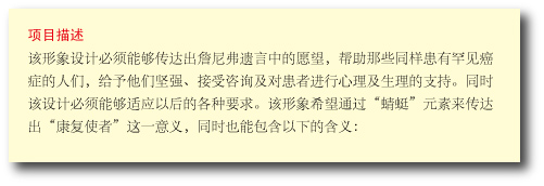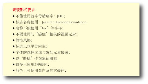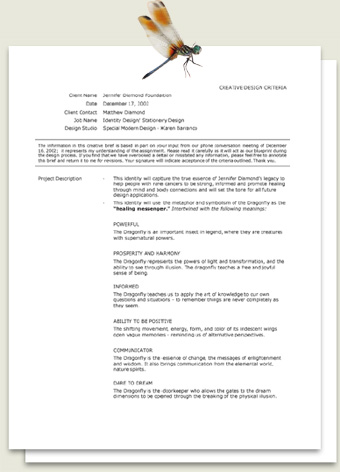 項目描述是這個設計的概述,主要是寫下“我們要做的是什么”及“為什么要做此項設計”。因為蜻蜓對于詹尼弗及她的家庭都具有特殊的象征意義,在一開始就已經(jīng)定下要采用“蜻蜓”這一形象來作為標志的主要圖案,所以這個要求應該開門見山地指出來。