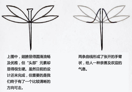 2、進一步簡化:我們用更簡單的線條對第一個構圖進行簡化,但出來的效果仍然難以讓人滿意。因為一對翼的形狀并不象是一只蜻蜓,但這個形象卻象天使。
