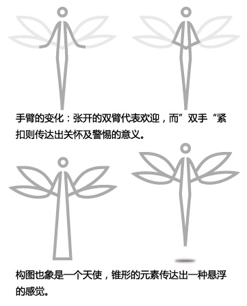 3、抽象的輪廓線:該形象仍然具有天使的形象,而且有兩對翼,也使這個構圖更象蜻蜓,而且昆蟲的感覺已經(jīng)弱化。一邊的兩個翼的元素也可看作是一扇翅膀在上下?lián)鋭印?/p>