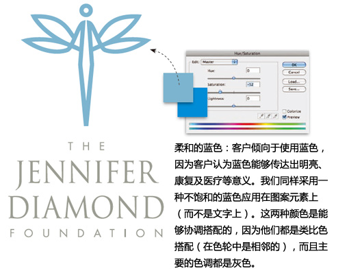一只色彩鮮艷的蜻蜓可以傳達出春天般的明亮氣息,但也顯得過于活躍。我們要將顏色的“聲調(diào)”降低,讓它傳達出一種柔和、安靜、專業(yè)及信任等信息。